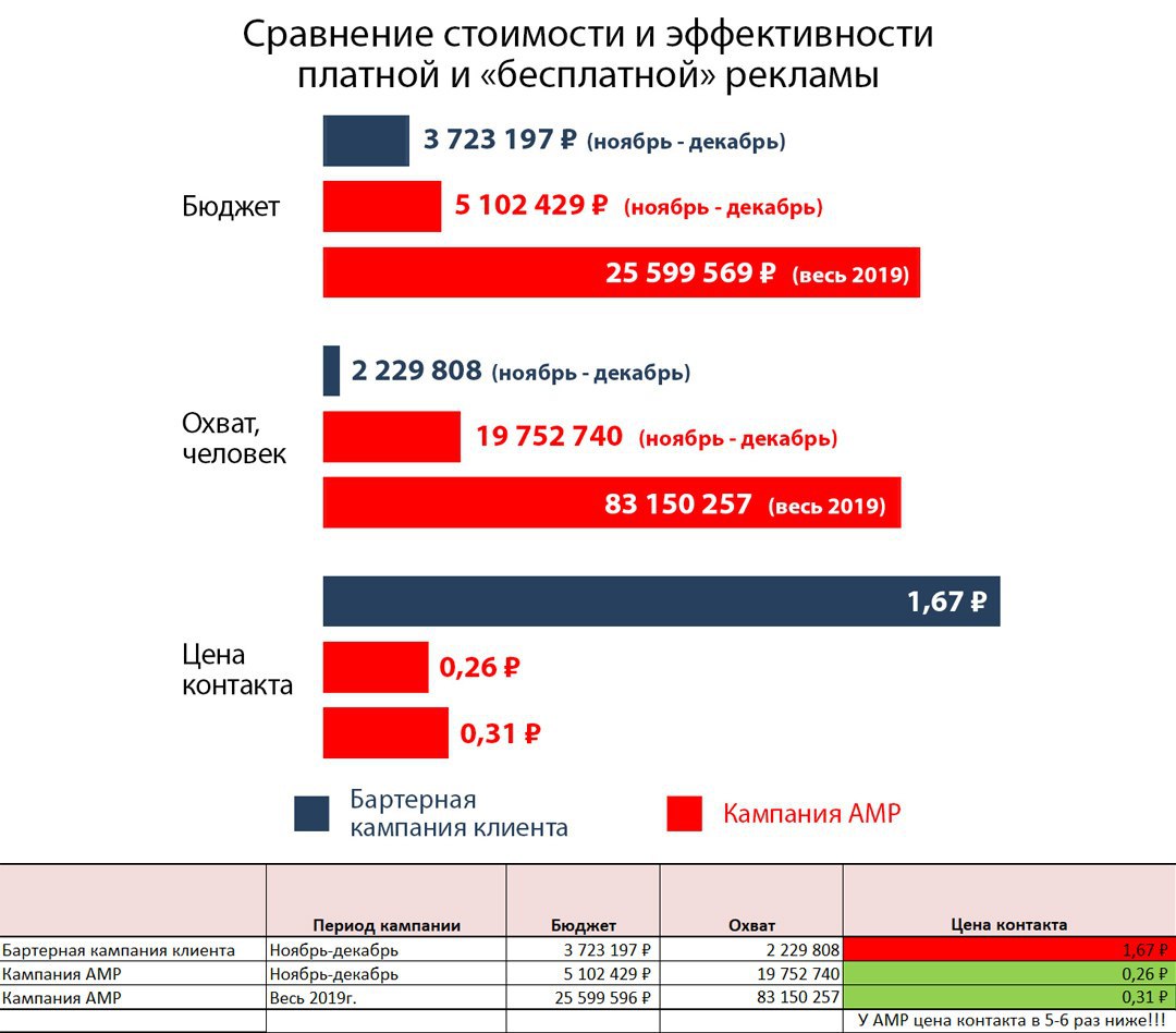 2. Самое главное. Итоговая стоимость контакта по размещениям у ВРОДЕ БЫ бесплатных блогеров, выполненным силами менеджеров клиента, получилась В ПЯТЬ РАЗ ВЫШЕ, чем по размещениям, которые за живые деньги делали мы. Даже с учётом нашей работы и нашей маржи, платные услуги АМР выгоднее, чем «бесплатные»!