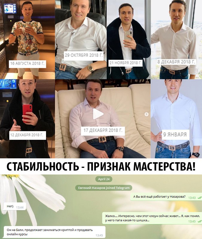 Помните мультимиллионера Евгения Назарова, который всю жизнь с одним блестящим (сорока, блин!) ремнём ходит? Я ему даже посвятил отдельный блок в статье «11 признаков профессионального инфоцыгана».