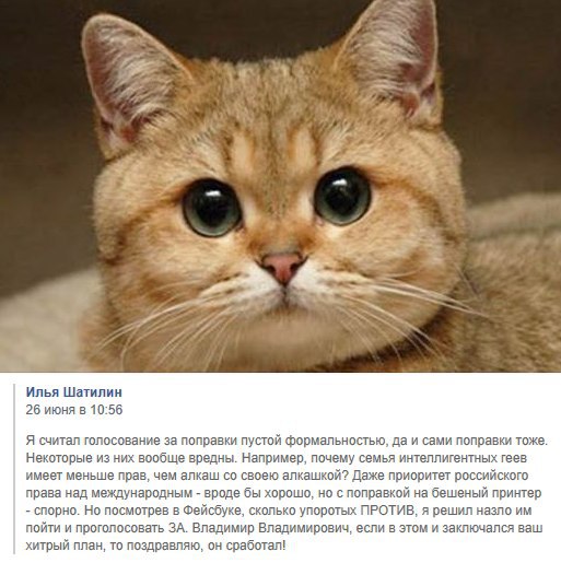 Голосовавших против на обеих площадках чуть-чуть больше, чем голосовавших за. При официальном кремлевском результате, грубо говоря, 25 % против, 75 % за. Но! Стоит понимать, что меня просто в силу специфики моей личности и контента, который я генерирую, читает аудитория, которая по уровню интеллекта заметно выше среднего. Плюс, в целом, в «Телеге» и «Фейсбуке» сидят люди с более либеральным (а значит, и стабильно «антипоправочным») мышлением. Тем не менее и в «Телеге», и в «Фейсбуке» за поправки проголосовало лишь чуть меньше людей, чем против. При этом я уверен, что никаких кремлеботов и проплаченных записных путинофилов у меня во френдах массово не присутствует. А еще я уверен в следующем: если вывесить аналогичные голосовалки в более «простонародных» социальных сетях и мессенджерах («Одноклассники», «Контач» и т. д.), то там количество проголосовавших за будет гораздо больше, чем против. Просто в силу специфики аудитории соответствующих соцсетей. Все это наталкивает меня на мысль, что официальные результаты голосования если и накручены кровавой гэбнёй, то незначительно. И на самом деле проголосовавших за поправки действительно больше, чем против.