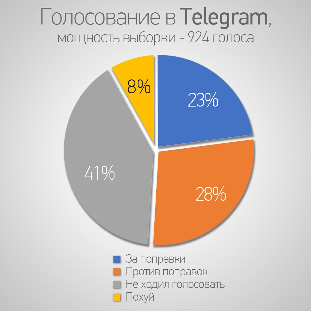 P. S. И вот еще какой о-о-о-очень интересный момент, прямо один из самых интересных во всем эксперименте! В «Телеге», к сожалению, практически нельзя отследить динамику голосования. А вот в «Фейсбуке» – можно. Пост с голосовалкой я повесил в 12:40, в разгар рабочего дня. И было очень четко видно, что сперва, до конца рабочего дня, гораздо активнее росло число голосующих ПРОТИВ поправок, а вот вечером начал проявляться очень заметный рост голосующих ЗА. Как думаете почему? Пишите в комментах. Мой вариант ответа на этот вопрос спрятан в предыдущем абзаце – внимательные найдут!
