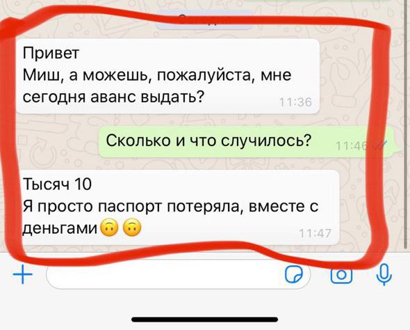 На скриншоте внизу – диалог с одной из моих юных сотрудниц. Она положила остаток зарплаты в паспорт и... пролюбила сразу и документ, и деньги. Ну и, разумеется, пришла ко мне просить аванс – чтобы просто протянуть до следующего зарплатного транша. Многие, возможно, скажут: ну че ты, мол, на девушку наезжаешь... Такое может случиться с каждым... Сумма-то смешная... И я отвечу: ах, если бы потеря паспорта с баблом была единственным проявлением ее распиздяйства! Сотрудница эта регулярно забывает сдавать отчеты, все время путает цифры и несвоевременно рапортует о вышедших публикациях... То есть это не разовый единичный факап, а системное поведение человека. И я, конечно, был несколько озадачен... даже не просьбой, а самим фактом случившегося: потерей паспорта с баблом.