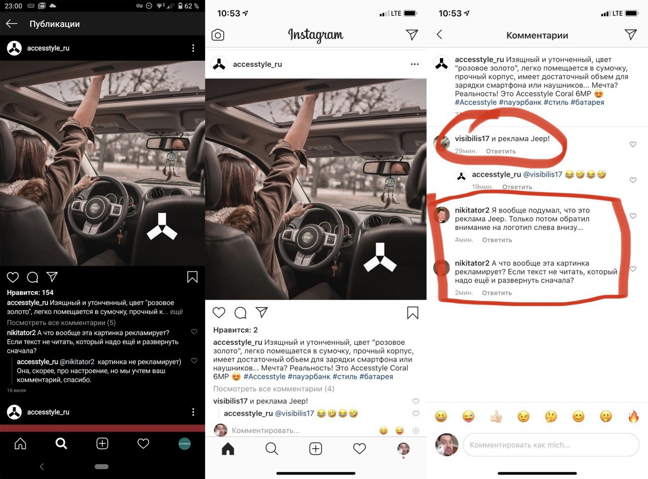Но взглянем на текст – может, он настолько гениален, что мне станет стыдно за претензии к картинке? Читаем, читаем, читаем... И приходим к выводу: в тексте ВНЕЗАПНО не упоминается, что же на самом деле рекламируется. Фразы типа «внешний аккумулятор», «батарея для смартфона», «павербанк» и так далее тупо отсутствуют. Указание на предмет рекламы есть только в хештегах, но они даже не видны, пока не развернешь текст (см. самый левый скрин ниже). Получается, что подписчик аккаунта видит просто фотку довольной бабы на джипе и надпись про что-то розовое с прочным корпусом.