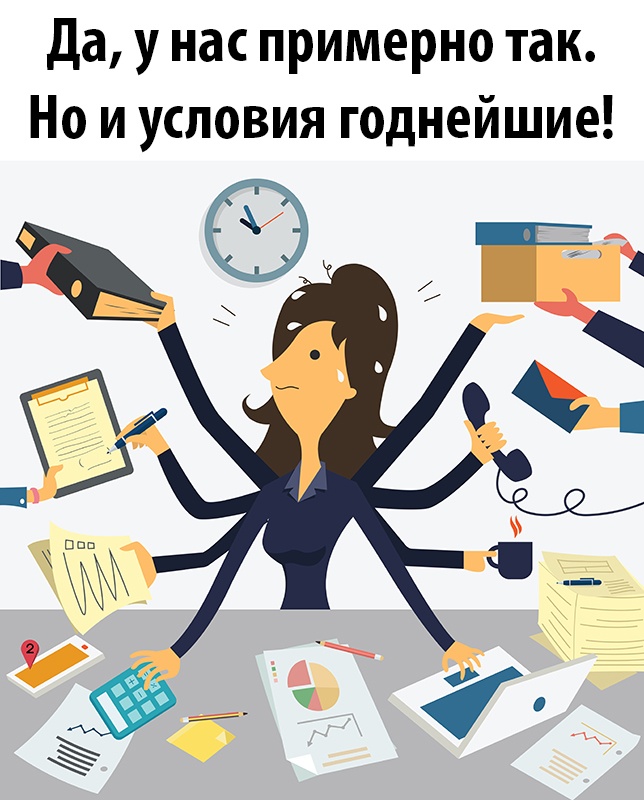 - умение и желание работать в режиме многозадачности, быстро, ничего не забывая, переключаясь с одной задачи на другую (работа подойдёт тем, кто не любит скучать на работе: только пришёл в офисе – фигакс, уже конец дня!);