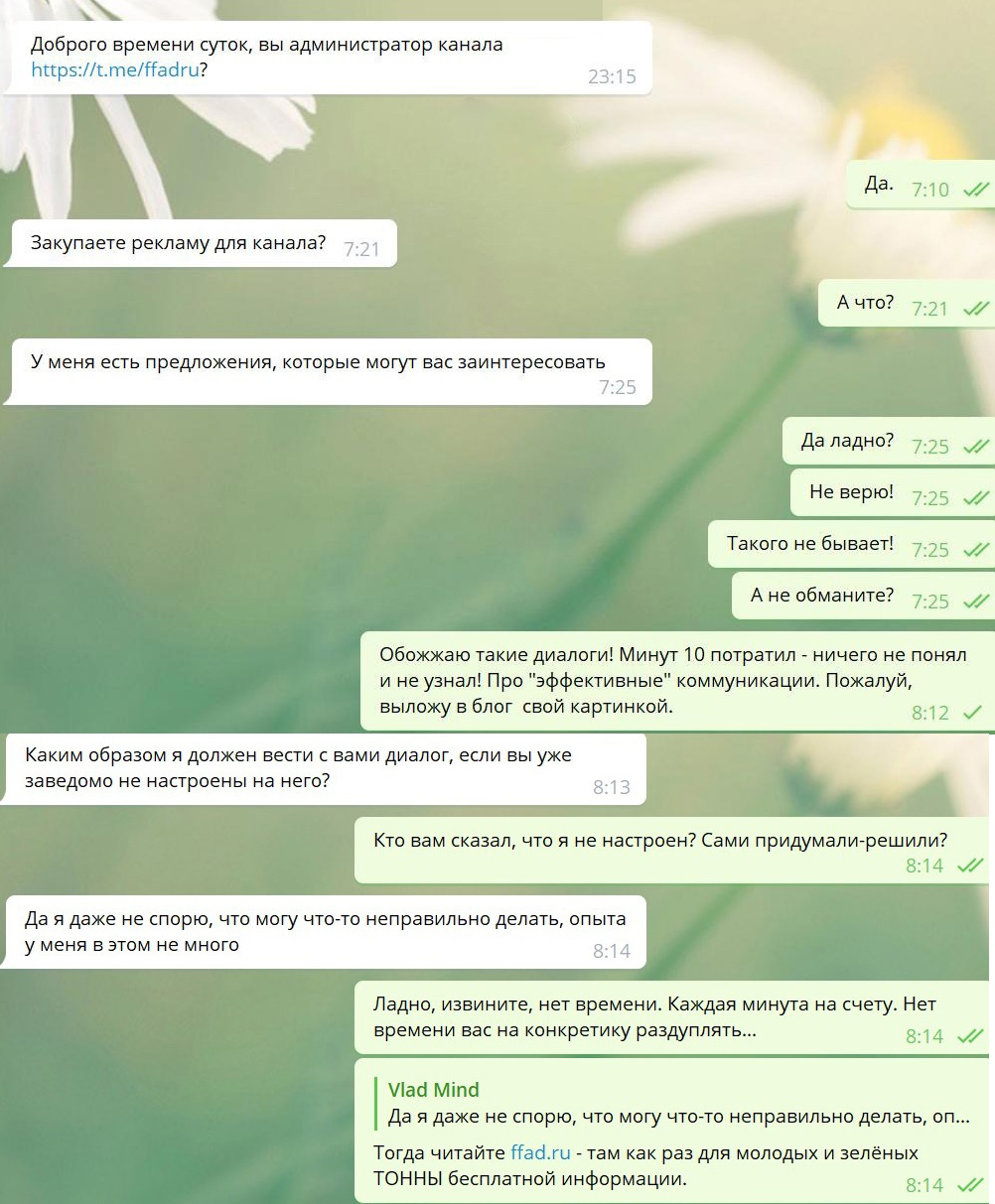Мои сотрудники знают мою телегу, где я регулярно высказываюсь (вот, например) на тему эффективности коммуникаций. Они знают мой сайт, где я тоже периодически затрагиваю эту тему. А вот что делать этому мальчику-рекламщику – я даже не знаю. Читать какие-то тексты он (а также еще мильоны таких же юных мальчиков и девочек), вероятно, не хочет или не может... Потому что тексты длинные, а при их прочтении нужно думать, напрягать голову, вникать в написанное и делать какие-то выводы... И вот тут приходит мысль, что, видимо, именно для таких людей могут быть реально полезными – не поверите, что слышите это от Фадеева!!! – инфоцыгане! С их вагинарами-тренингами в онлайне, где реально можно почерпнуть какие-то совершенно базовые коммуникационные навыки. Не всегда, но можно. Занес тысячу рублей – и тебе рассказали, как надо писать сообщения взрослым дядям, чтобы они над тобой не измывались и не стебались.