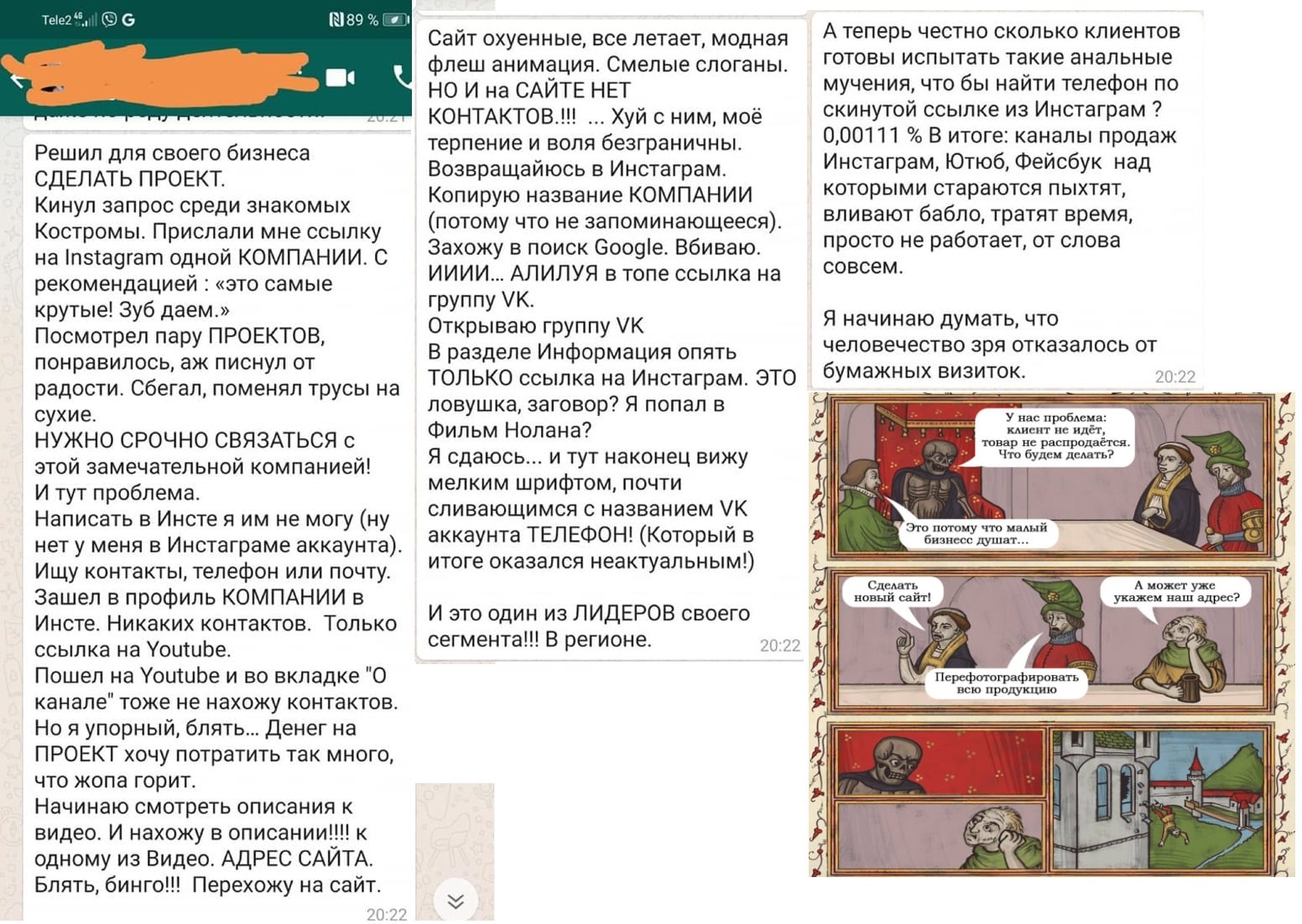 - Так у вас, блядь, контактов нет ни на сайте, ни в соцсетях!