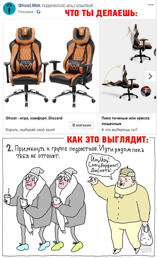 Если вы продвигаете товар для молодёжной аудитории и очень хочется говорить с ними на одном языке, контентом должен заниматься кто-то реально молодой. А то будете как эти кресла. Подробно об этой теме — в нашем кейсе работы со стримерами.