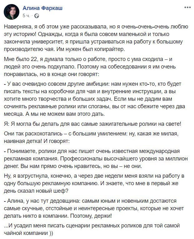 На скриншоте — отличная история из жизни от Алины Фаркаш
