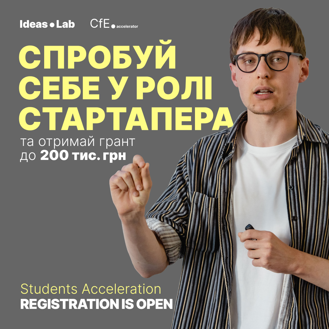 «IdeasLab» — це 11-тижнева програма для студентства, яка надає можливість перевірити свої ідеї на відповідність реальності. Перетворюй їх на конкретний продукт і отримуй фінансову підтримку до 200 000 грн.