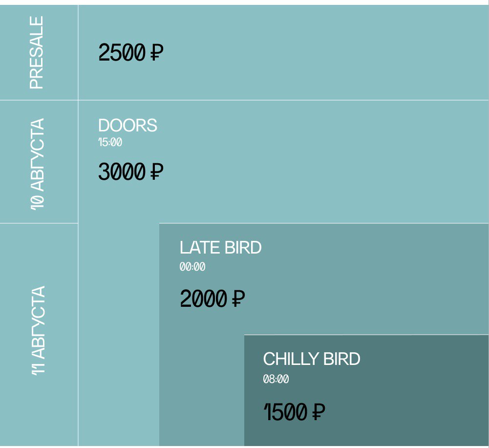 • И последний вариант — билет «Chilly Bird». Если вы приходите на фестиваль 11 августа после 8:00, то билет обойдется вам всего в 1500 рублей.