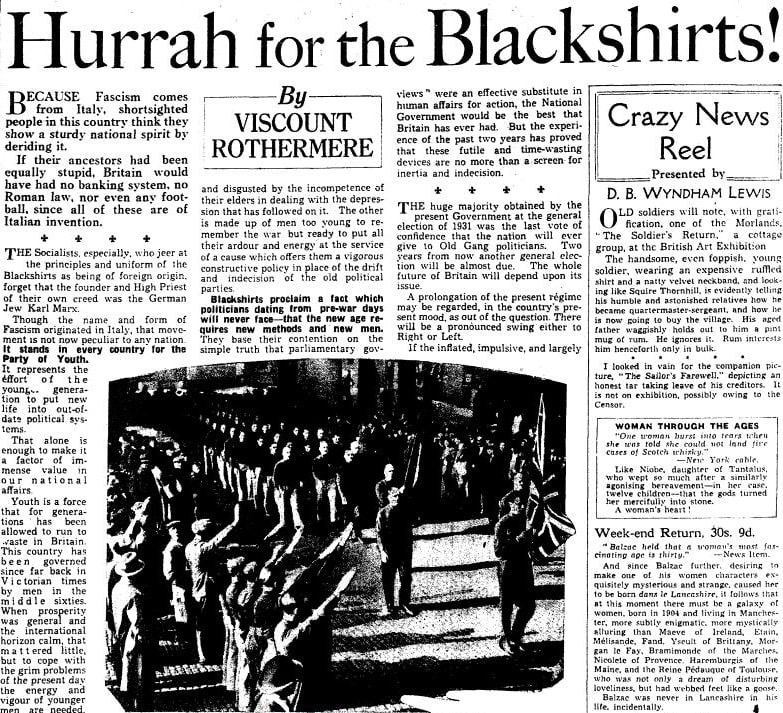15 января 1934 года популярный британский таблоид Daily Mail опубликовал статью под названием «Ура Чёрным рубашкам!» в поддержку местного фашистского движения Освальда Мосли.
