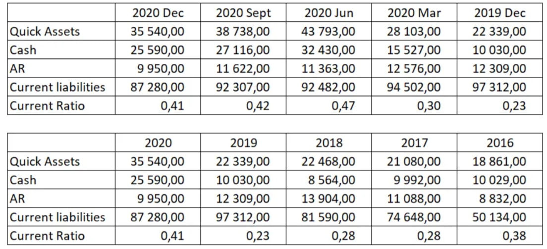 Пример2: Компания получила в конце года долгосрочный кредит от банка на счёт. В текущие активы включаются денежные средства на счетах (попадают в числитель дроби), а кредит не попадает в текущие обязательства, поскольку это долгосрочные заимствования. При этом без этого кредита картина была бы иной.