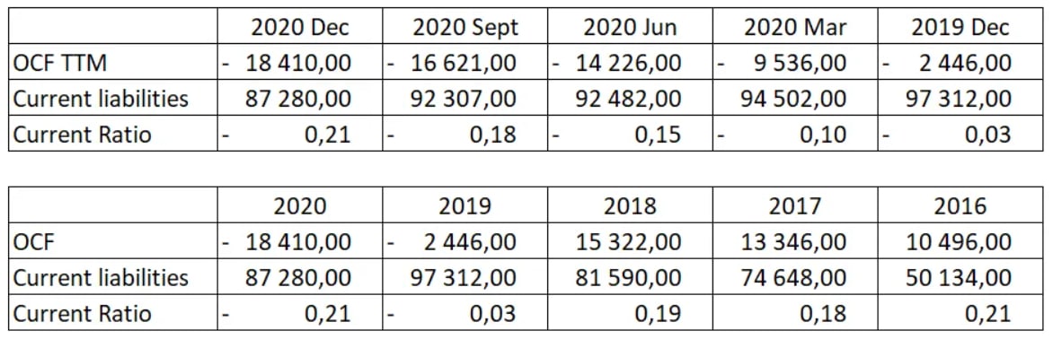 Как мы видим на примере Боинга этот коэффициент может быть и отрицательным, что указывает на то, что компания финансирует свои текущие обязательства за счёт заемных денежных средств и уже давно.