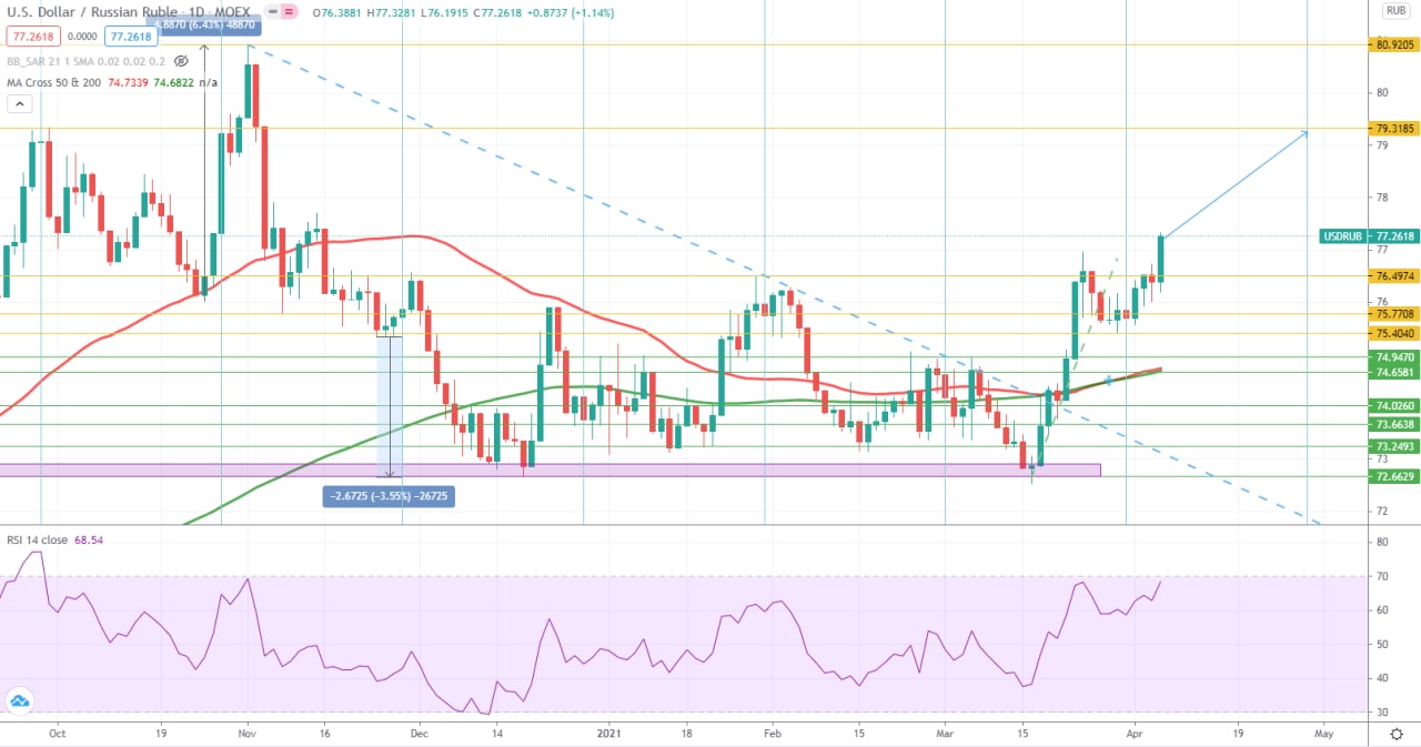 С учётом преодоления уровня 76,5 за закрепления выше, есть все шансы дойти как минимум до 79. Не стоит забывать о том, что дамоклов меч американский санкций только повешен, а когда он обрушится не известно.
