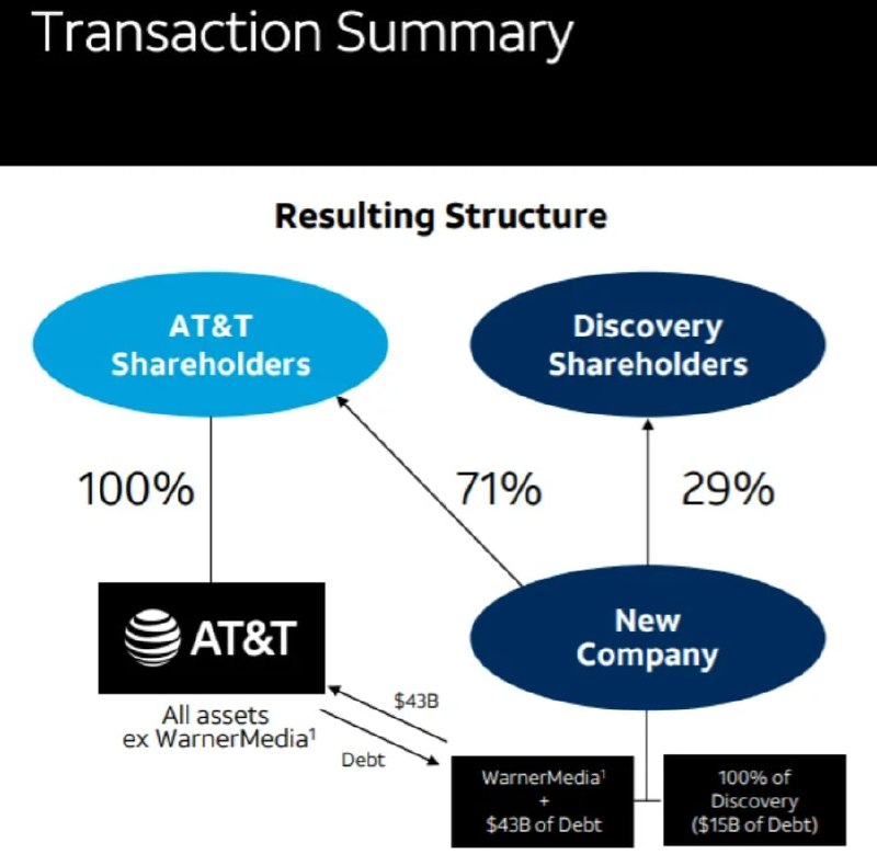🔸AT&T внесет почти все свои активы WarnerMedia, а также $43 млрд долга в спин-офф(новую выделяемую компанию), которая одновременно объединится с Discovery. В результате новая компания будет принадлежать 29% существующих акционеров Discovery и 71% существующим акционерам AT&T. После появления новой компании в середине 2022 года AT&T вернется к основам в качестве поставщика услуг телефонной и интернет-связи.