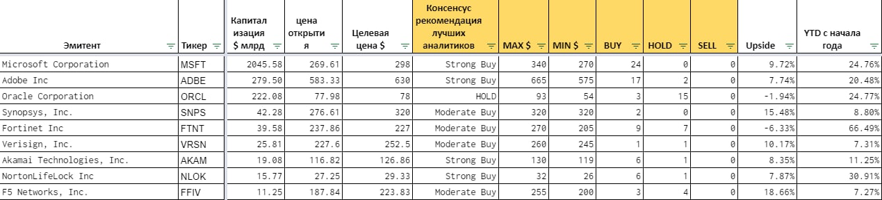 Лучшие оценки strong buy(upside) у Microsoft (9.72%), Adobe (7.74%), Akamai (8.35%), NortonLifeLock (7.87%)