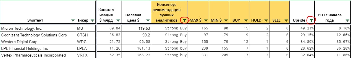 Для примера, можно отобрать акции с рекомендацией strong buy и max upside, как сделано в приложенной картинке ниже.
