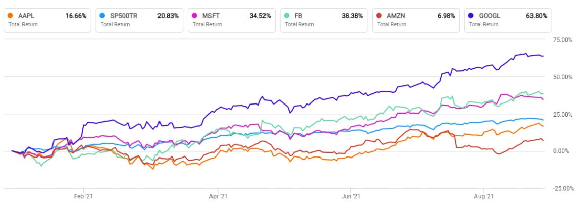 🔸Если посмотреть на динамику акций мега-капитализации в 2021 году, то GOOGL, MSFT и FB превзошли S&P 500 в целом. Между тем $AMZN и $AAPL не оправдали ожиданий :