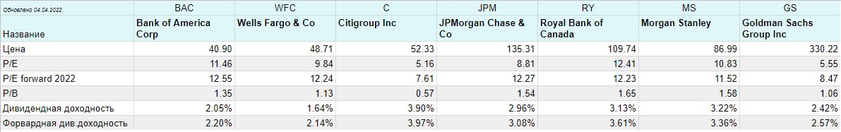 Исходя из текущих показателей среди классических банков по мультипликаторам продолжает лучше прочих выглядеть Citi. Напомню банк сворачивает деятельность во многих уголках мира, что долгосрочно негативно скажется на результатах. Кроме того будут списания из-за закрытия отделений. Тем не менее p/b 0.57 говорит о недооценке в 43% от балансовой стоимости, что очень много, и p/e forward говорит о том, что банк стоит около 8 годовых прибылей.