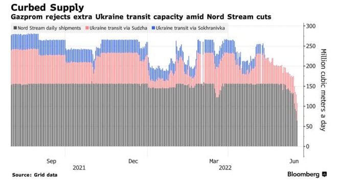 «Газпром» решил не резервировать дополнительное мощности для поставок газа в Европу по украинским трубопроводам на июль на аукционе в понедельник, как показывают результаты бронирования . Это еще один признак того, что поставки газа могут оставаться ограниченными дольше после того, как Газпром сократил поставки по трубопроводу «Северный поток» — своему крупнейшему газовому маршруту в Европейский Союз — всего до 40% его пропускной способности.