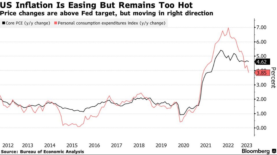 ЦБ всего мира старается во всю, чтобы придушить экономику. И, казалось бы, к чему это им, раз инфляция приходит в норму. Но тут вероятно 2 причины: эффект высокой базы прошлого года ( посмотрите в РФ 🇷🇺 инфляция 3% ) , и базовая инфляция , которая падает не так быстро, как хотелось бы.
