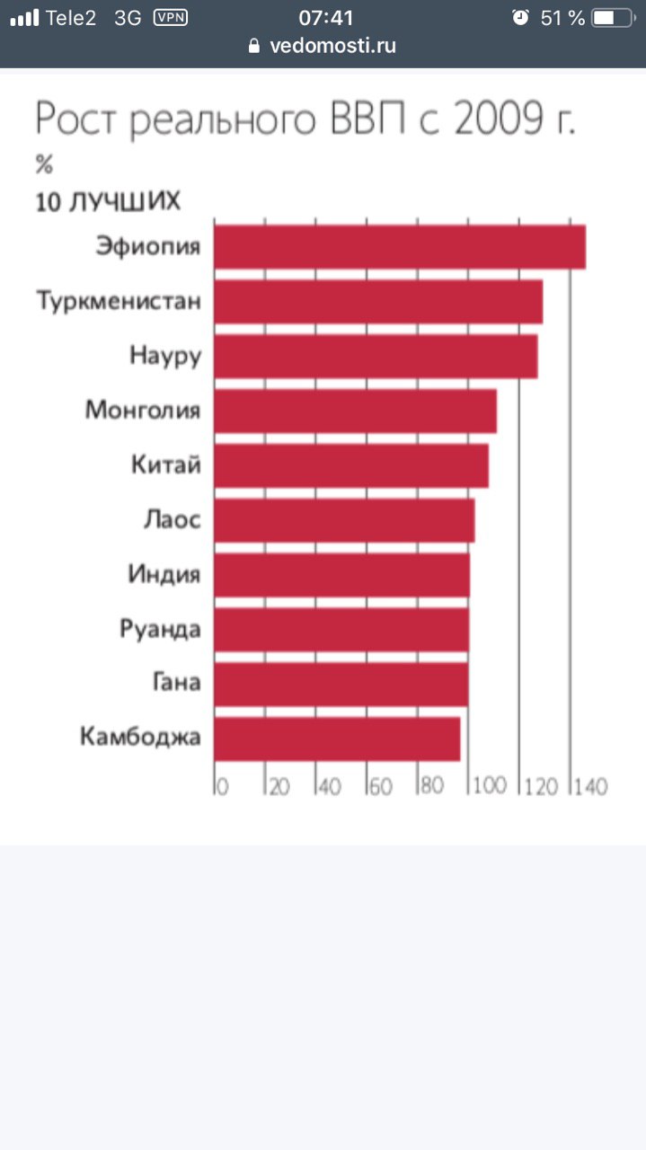 Результат последнего десятилетия. Самыми успешными экономиками оказались соседи или последователи Китая. ВВП Эфиопии, например, вырос почти на 147%. Индия, Туркменистан, Монголия, Лаос, Камбоджа, Руанда - все они внедряют интересные и действенные модели в свою экономику, активно инвестируют в инфраструктуру и производство. На наших глазах разворачивается чудесный сценарий, в котором уровень жизни жителей этих стран неуклонно растет, а доля бедного населения значительно снижается.