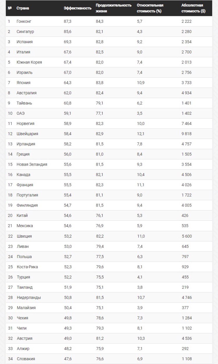 Рейтинг стран мира по эффективности систем здравоохранения составлен аналитиками агентства Bloomberg на основании данных Всемирной организации здравоохранения, Организации Объединенных Наций и Всемирного банка (The Most Efficient Health Care). В основе рейтинга три ключевых показателя, которые определяют эффективность системы здравоохранения той или иной страны: средняя ожидаемая продолжительность жизни при рождении, государственные затраты на здравоохранение в виде процента от ВВП на душу населения, стоимость медицинских услуг в пересчете на душу населения.