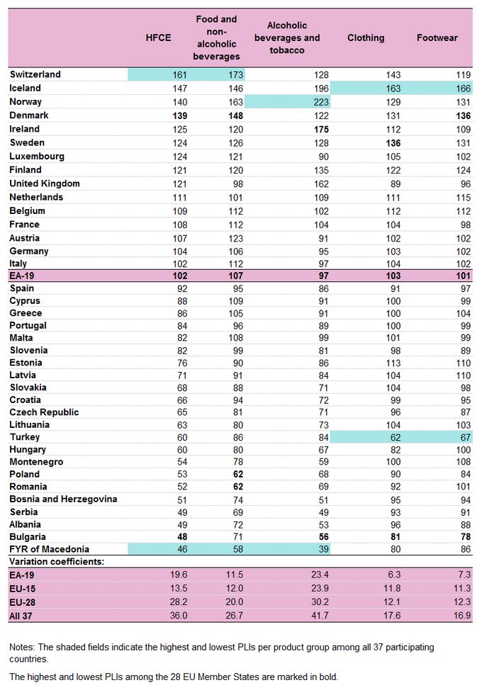 Также включены несколько стран, не входящих в ЕС. В Швейцарии - самый высокий уровень цен на продукты питания и безалкогольные напитки. В Исландии «кусаются» цены на одежду и обувь. В Норвегии - алкоголь.