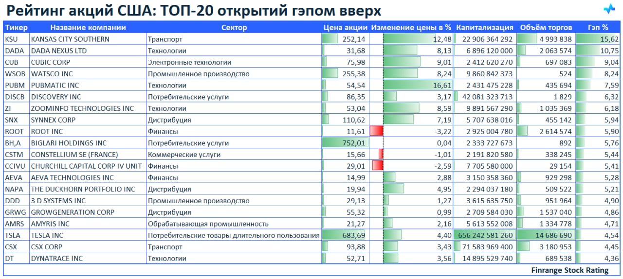 🚀Рейтинг акций: ТОП-20 открытий гэпом вверх🇺🇸