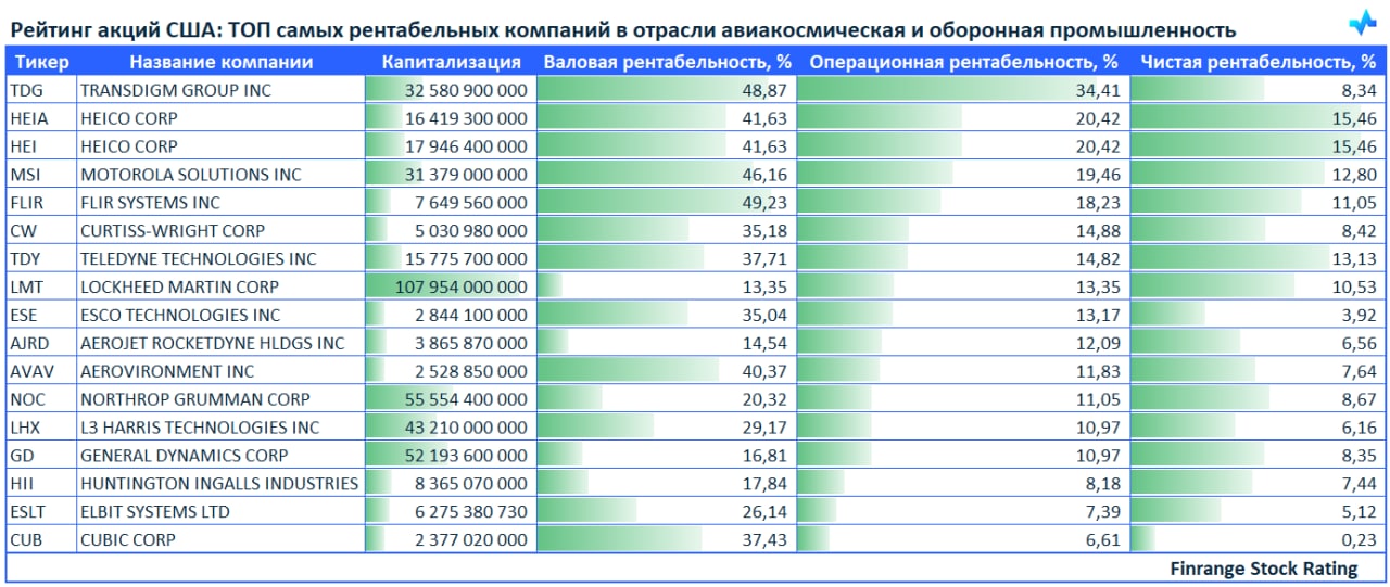 💪Рейтинг акций США: ТОП самых рентабельных компаний в отрасли авиакосмическая и оборонная промышленность🇺🇸