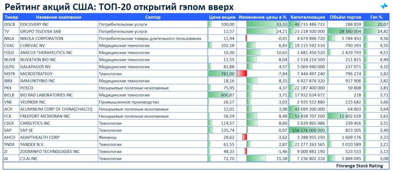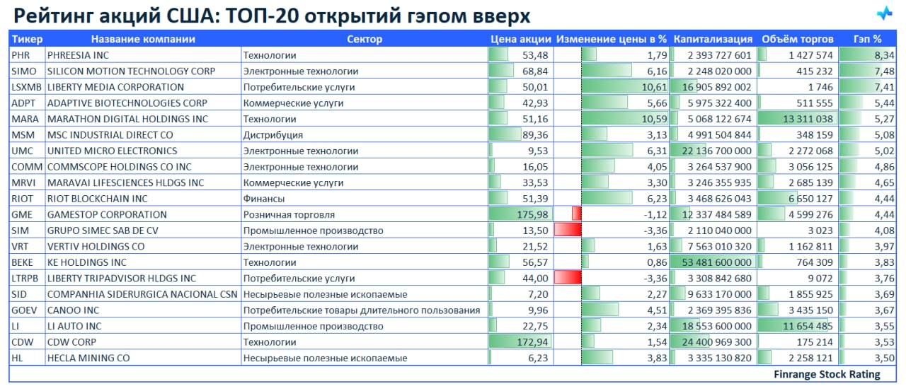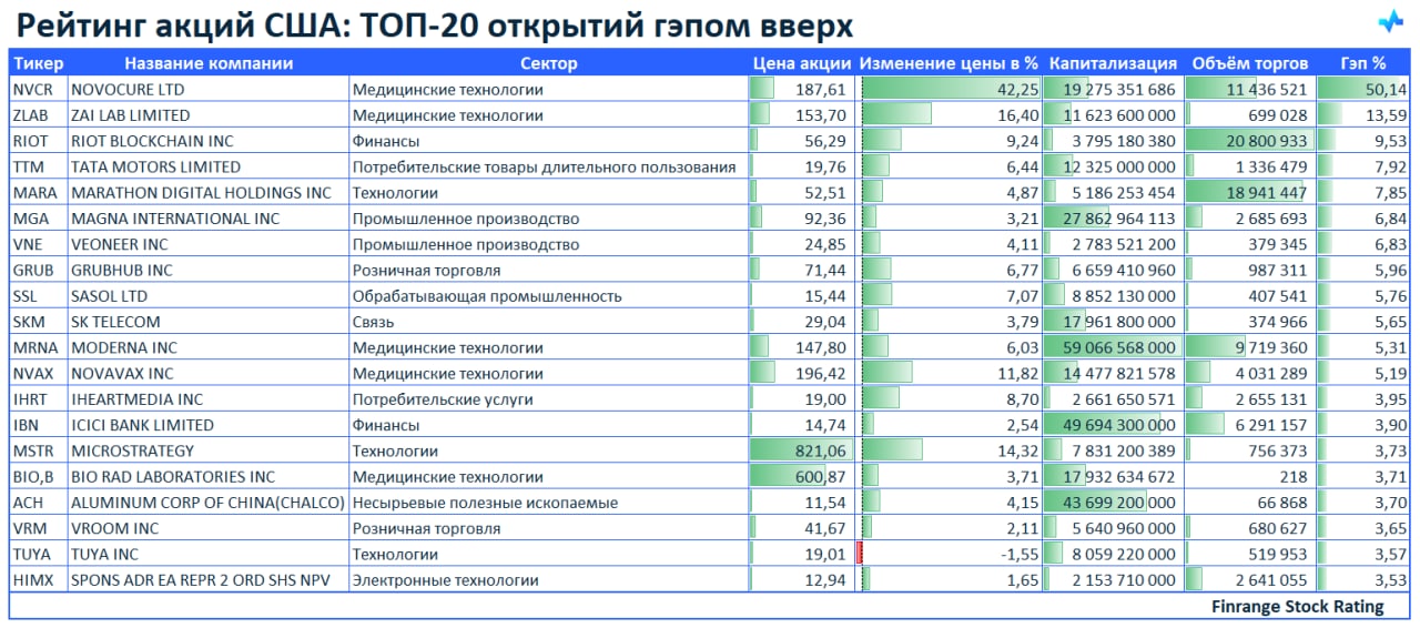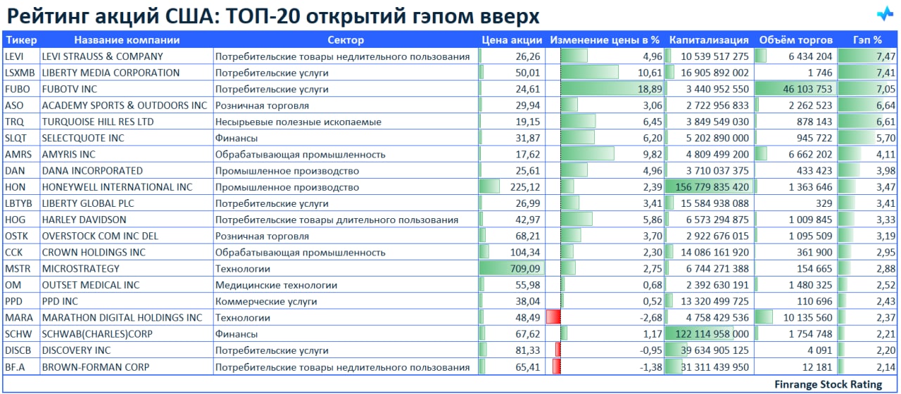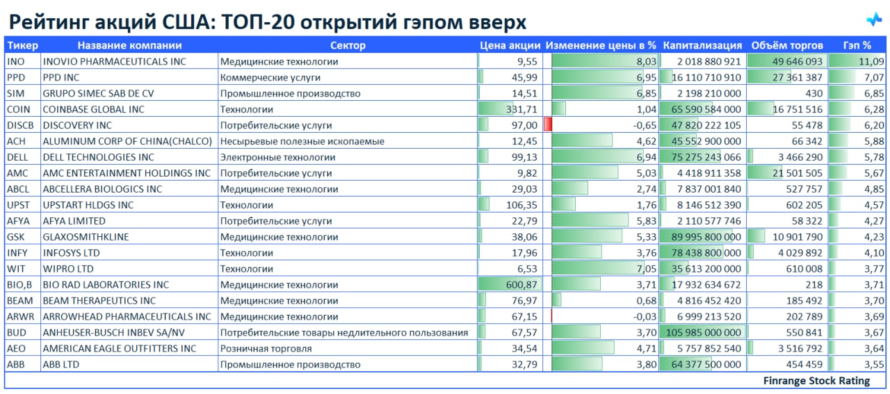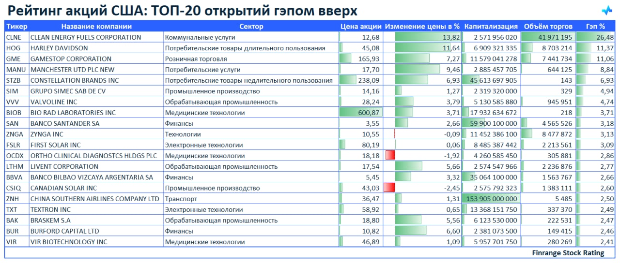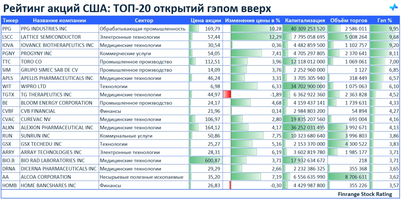 🚀Рейтинг акций: ТОП-20 открытий гэпом вверх🇺🇸