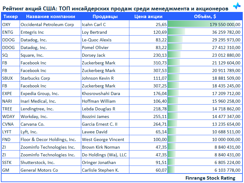 Представляем вашему вниманию свежую информацию по инсайдерским продажам среди менеджмента компаний и крупных акционеров. В этот раз больше всего продаж наблюдалось в акциях Occidental Petroleum Corp #OXY.