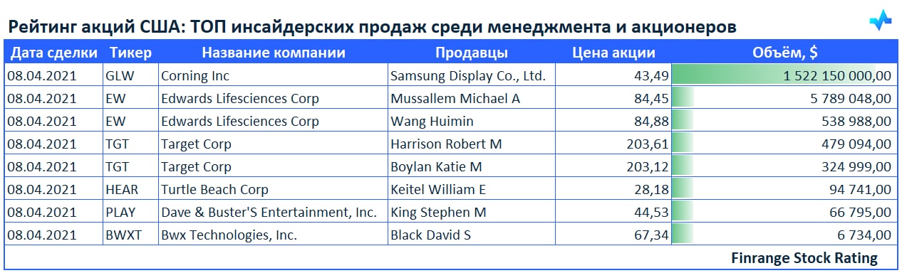 Представляем вашему вниманию свежую информацию по инсайдерским продажам среди менеджмента компаний и крупных акционеров. В этот раз больше всего продаж наблюдалось в акциях Corning Inc #GLW.