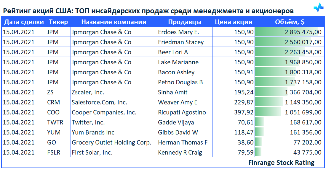 Представляем вашему вниманию свежую информацию по инсайдерским продажам среди менеджмента компаний и крупных акционеров. В этот раз больше всего продаж наблюдалось в акциях Jpmorgan Chase & Co #JPM.