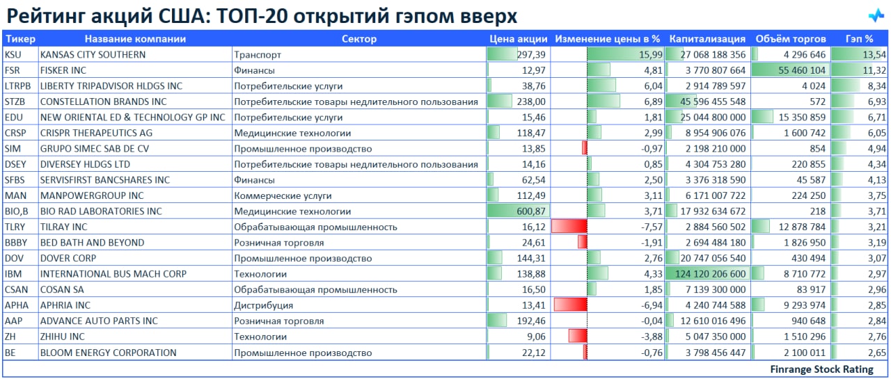 Представляем вашему вниманию топ-20 акций, которые открылись гэпом вверх. В лидерах сегодня акции KANSAS CITY SOUTHERN #KSU.