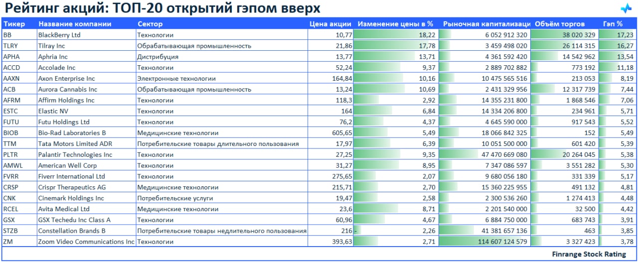 Представляем вашему вниманию топ-20 акций, которые открылись гэпом вверх. В лидерах сегодня акции BlackBerry Ltd #BB.