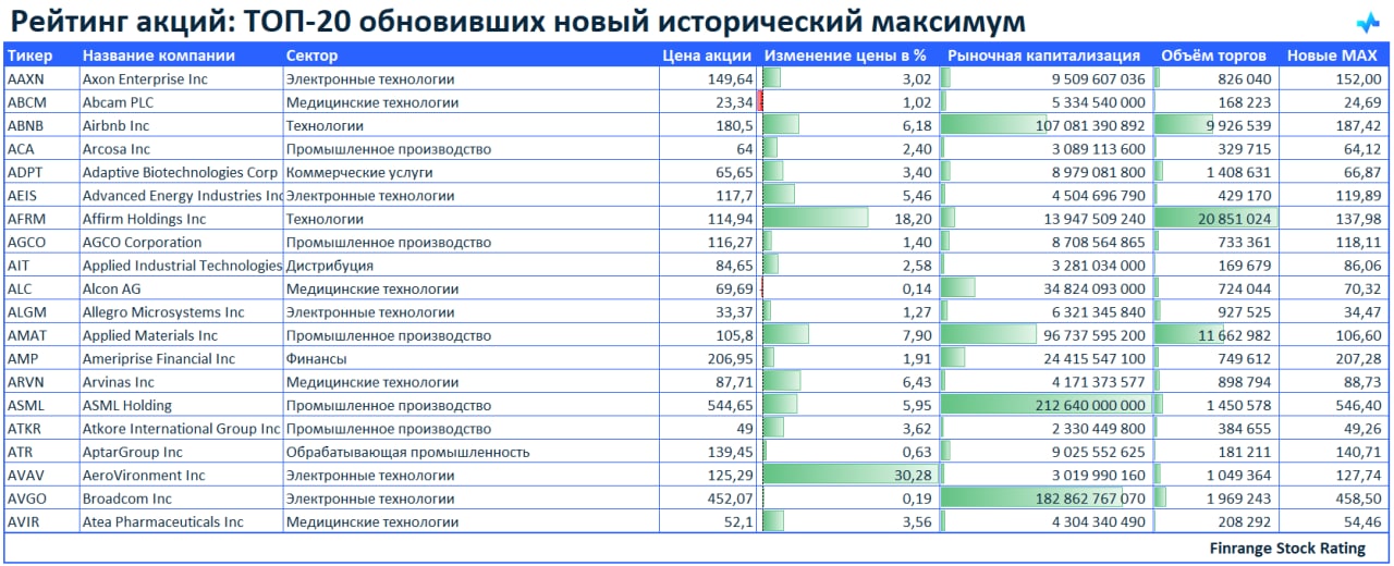 📈Рейтинг акций: ТОП-20 обновивших новый исторический максимум