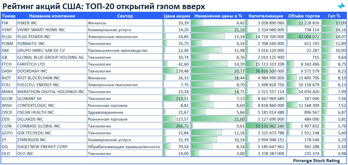 Представляем вашему вниманию топ-20 акций, которые открылись гэпом вверх. В лидерах сегодня акции FISKER INC #FSR.