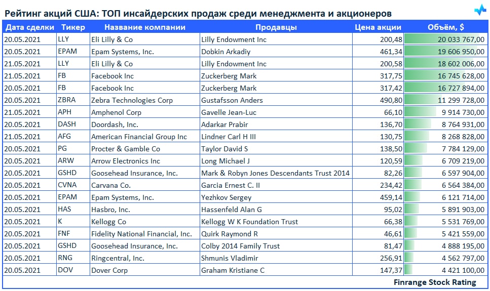 Инсайдерские продажи показывают отношение менеджмента и акционеров к компании. Обычно информация о продажи акций топ-менеджерами воспринимается негативно, считается, что они не верят в собственную компанию или возможно в ближайшее время у компании дела будут идти плохо.