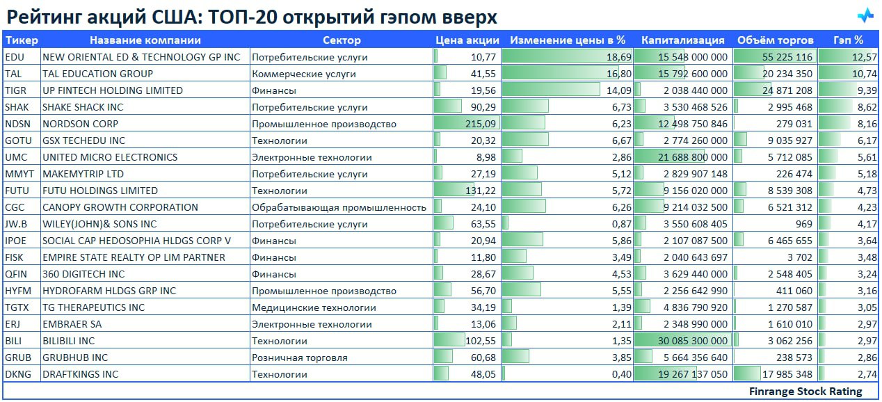 Представляем вашему вниманию топ-20 акций, которые открылись гэпом вверх. В лидерах сегодня акции NEW ORIENTAL ED & TECHNOLOGY GP INC #EDU.