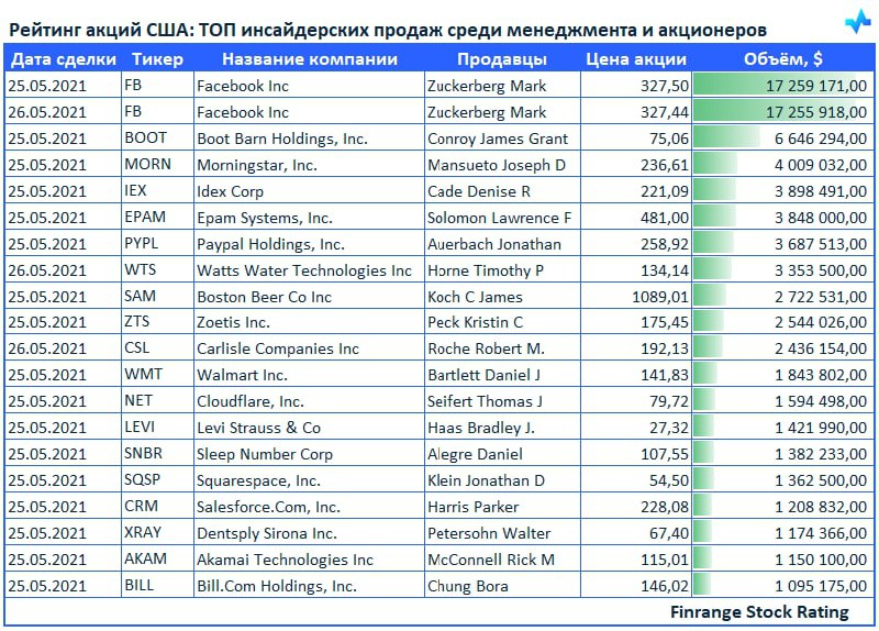 Представляем вашему вниманию свежую информацию по инсайдерским продажам среди менеджмента компаний и крупных акционеров. В этот раз больше всего продаж наблюдалось в акциях Facebook #FB.