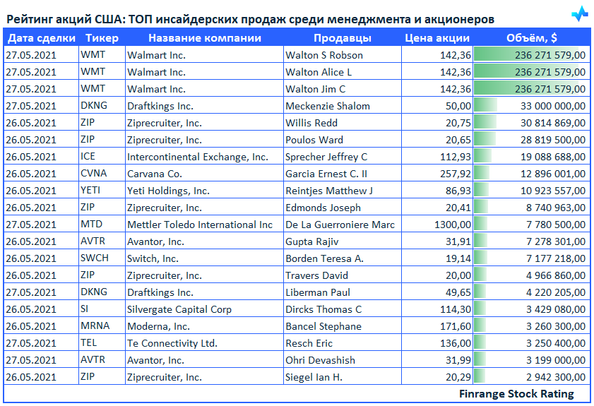 Представляем вашему вниманию свежую информацию по инсайдерским продажам среди менеджмента компаний и крупных акционеров. В этот раз больше всего продаж наблюдалось в акциях Walmart Inc #WMT.