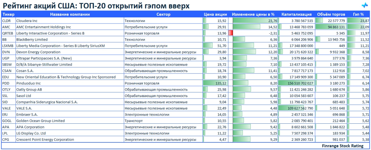 Представляем вашему вниманию топ-20 акций, которые открылись гэпом вверх. В лидерах сегодня акции Cloudera Inc #CLDR.