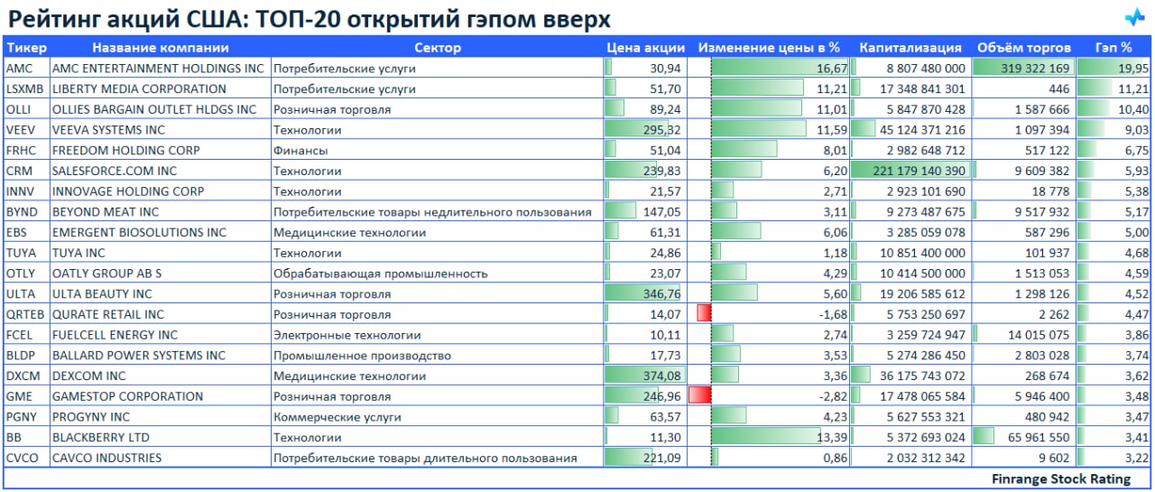 Представляем вашему вниманию топ-20 акций, которые открылись гэпом вверх. В лидерах сегодня акции AMC ENTERTAINMENT HOLDINGS INC #AMC.