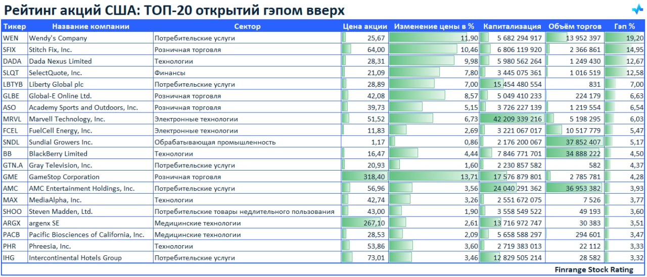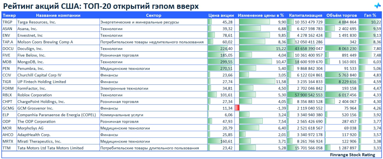 🚀Рейтинг акций: ТОП-20 открытий гэпом вверх🇺🇸