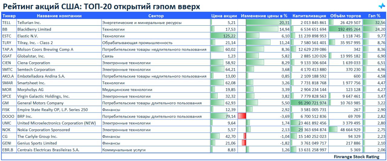 Представляем вашему вниманию топ-20 акций, которые открылись гэпом вверх. В лидерах сегодня акции Tellurian Inc #TELL.