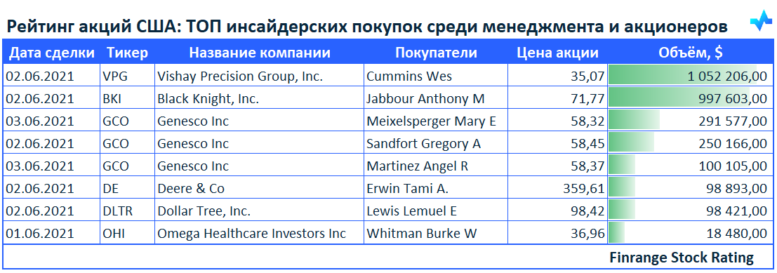 Инсайдерские покупки показывают отношение менеджмента и акционеров к компании. Обычно информация о приобретении акций топ-менеджерами воспринимается позитивно, считается, что они верят в собственную компанию.