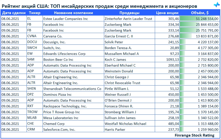 Инсайдерские продажи показывают отношение менеджмента и акционеров к компании. Обычно информация о продажи акций топ-менеджерами воспринимается негативно, считается, что они не верят в собственную компанию или возможно в ближайшее время у компании дела будут идти плохо.