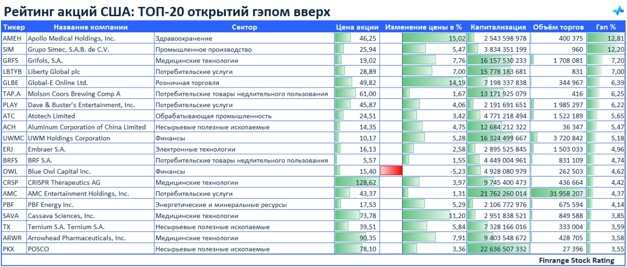 🚀Рейтинг акций: ТОП-20 открытий гэпом вверх🇺🇸