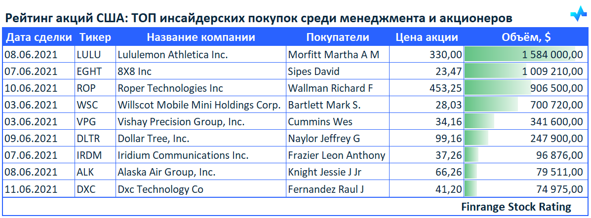 Представляем вашему вниманию свежую информацию по инсайдерским покупкам среди менеджмента компаний и крупных акционеров. В этот раз больше всего покупок наблюдалось в акциях Lululemon Athletica Inc #LULU.