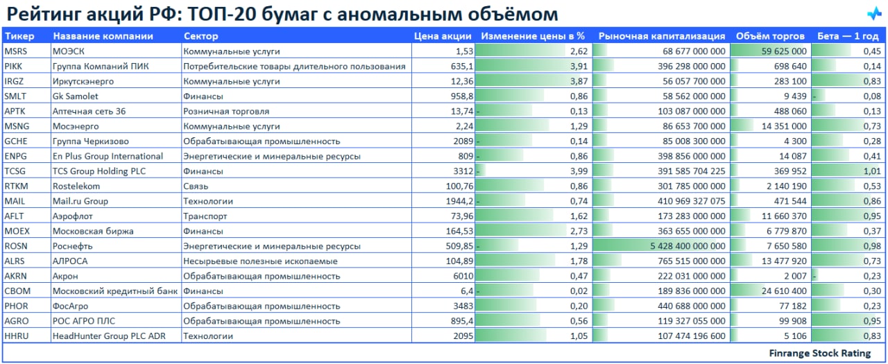 ⚡️Рейтинг акций РФ: ТОП-20 бумаг с аномальным объёмом🇷🇺